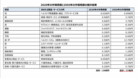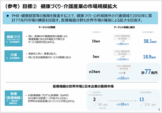 2023年に経済産業省が公表した「新しい健康社会の実現に向けた『アクションプラン』2023」の資料においては、健康づくり・介護産業の市場規模拡大についても上記画像のように触れられています。