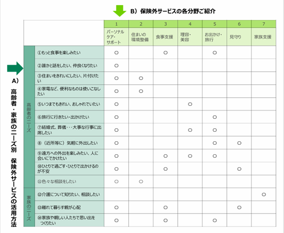 2020年3月に株式会社日本総合研究所が公表した「QOLを高める保険外(自費)サービス活用推進ガイド」では、高齢者の介護ニーズに対しどの介護保険外サービスが対応しているかを画像のような表にまとめました。