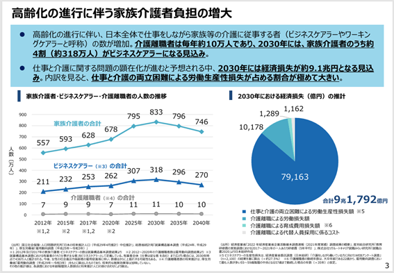 「経済産業省における介護分野の取組について」の資料では、2012年から2040年までの家族介護者・ビジネスケアラー・介護離職者の人数の推移を推計値も含めて公表しました。
