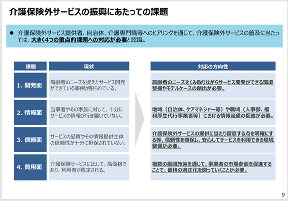 「経済産業省における介護分野の取組について」では、介護保険外サービスをもっと振興させるには上記画像のような4つの課題があるとしています。