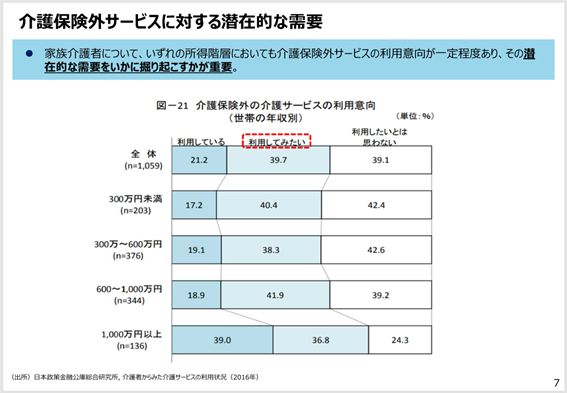 またいずれの所得階層でも介護保険外サービスを利用してみたいと感じる人は40%前後おり、潜在的なニーズが大きいことがわかります。