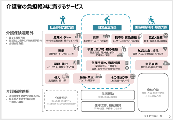 2024年3月に経済産業省ヘルスケア産業課が公表した「経済産業省における介護分野の取組について」の資料では、介護保険外サービスには上記画像のような種類があるとわかります。
