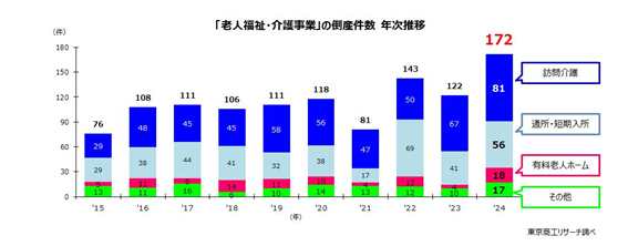 2024年に株式会社東京商工リサーチが行った「老人福祉・介護事業」の倒産調査において、倒産件数が過去最多の172件だったことがわかりました。