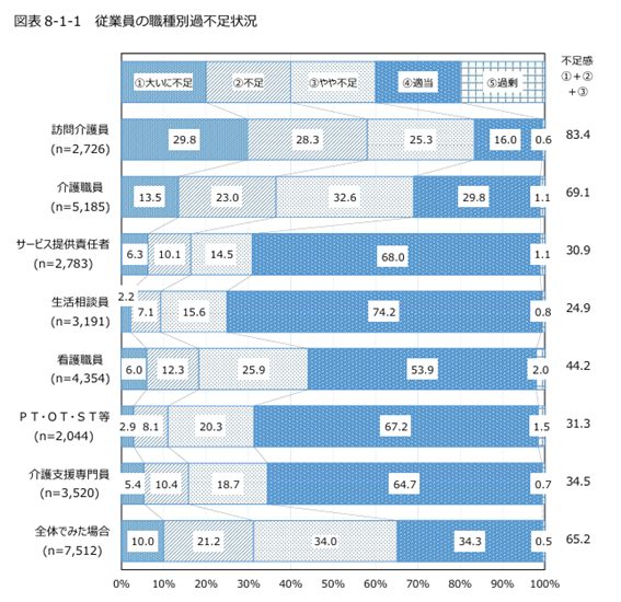 全体でみた場合「大いに不足」「不足」「やや不足」と回答した介護事業者の合計が65.2%を占めており、介護業界全体が人手不足であるのが一目でわかる結果となっています。