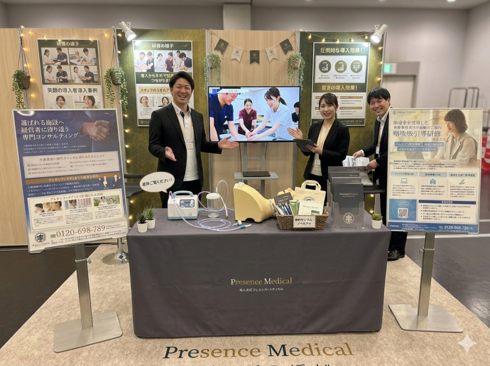 弊社ブースでは、介護現場における慢性的な人手不足の解消や、今後の制度変化に向けた具体的なソリューションとして、全国トップクラスの実績を誇る「喀痰吸引等研修」の導入スキームを中心にご紹介させていただきました。加えて、次世代の介護・医療連携を見据えた弊社の新たな取り組みについてもご案内し、多くの反響をいただきました。